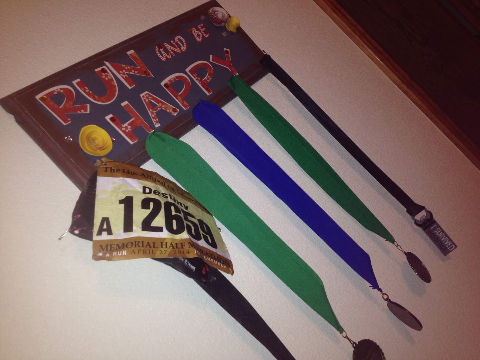 I painted it gray, added some brown around the edges, sanded it to made it look more rustic, used a Cricket to cut out the letters, added some rolled paper flowers, a few sparkly gems, some hooks, and voila! My very own designated place JUST for MY medals!
